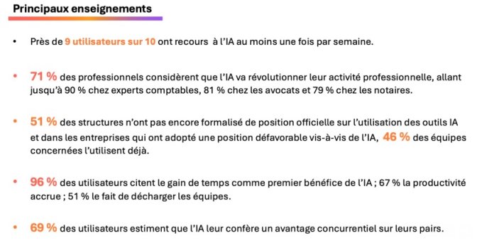 "Si l’IA s’est désormais installée dans leur quotidien, son adoption repose d’abord sur les usages des collaborateurs, sans attendre la définition d’un cap clair par les directions : plus d’1 structure juridique et comptable sur 2 n’a toujours pas de position sur l’IA ; et dans les entreprises qui ont adopté une position défavorable vis-à-vis de l’IA 46 % des équipes concernées l’utilisent déjà. "